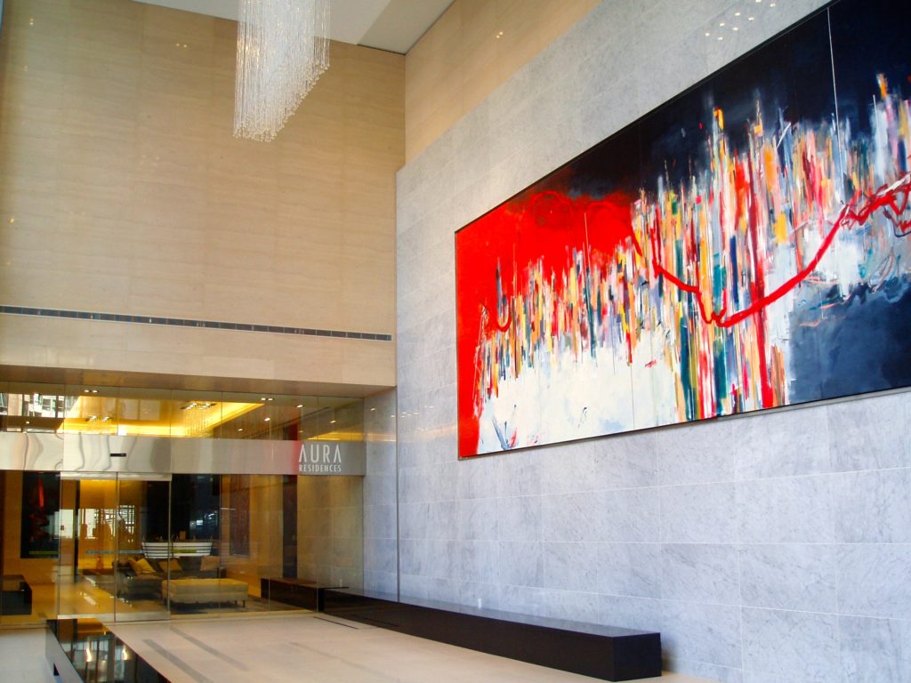 I would agree that the lobby is definitely “soaring”! I’d even say it’s taller than suggested as it’s two commercial stories, which is roughly equivalent to four residential stories. The art is bold and has great presence in the public gallery.