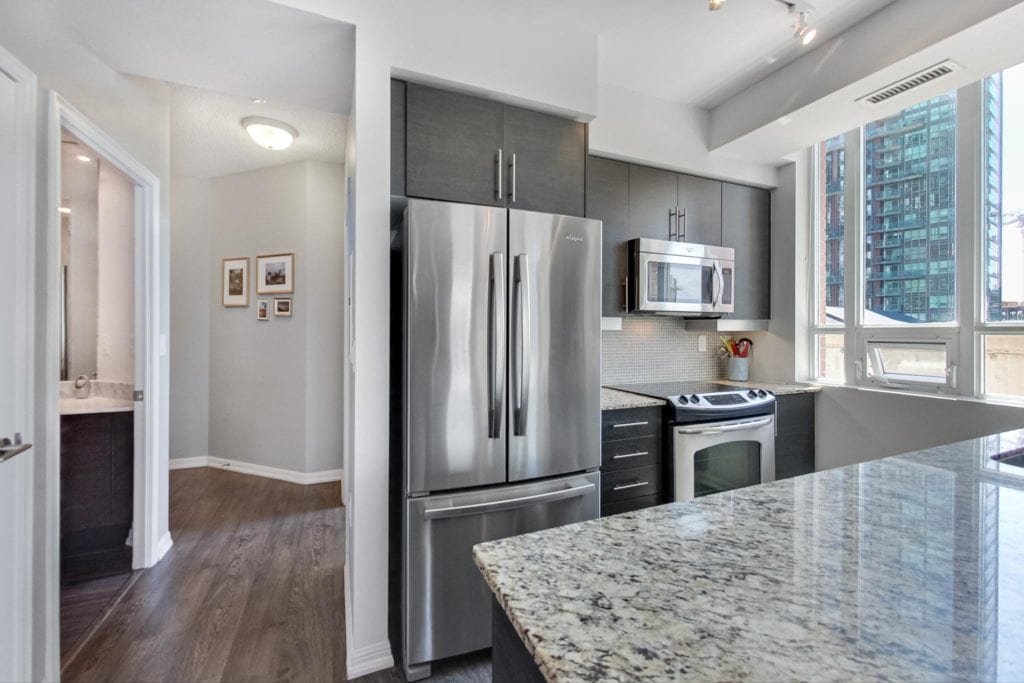 Includes all appliances, light fixtures, window coverings, parking & locker. Take advantage of the dog park right outside the front entrance! Conveniently located directly beside the new pedestrian bridge to King Street. Centrally located to all shops, restaurants & services in Liberty.