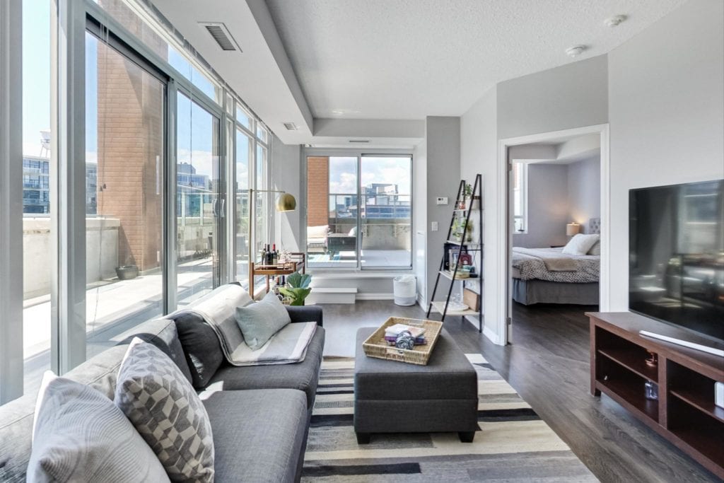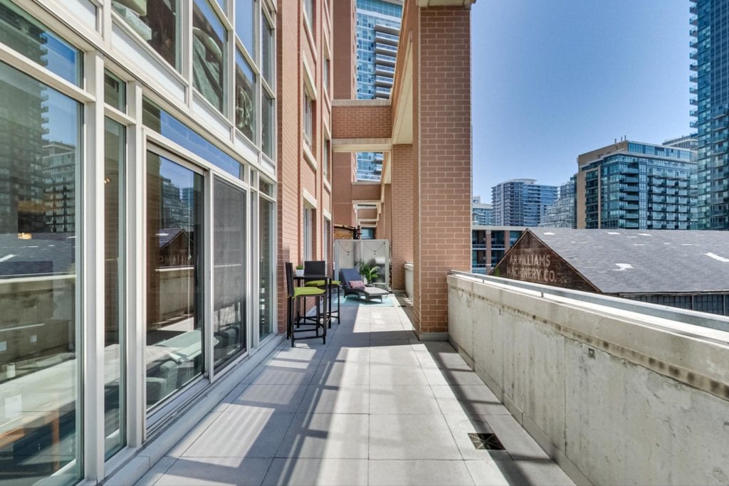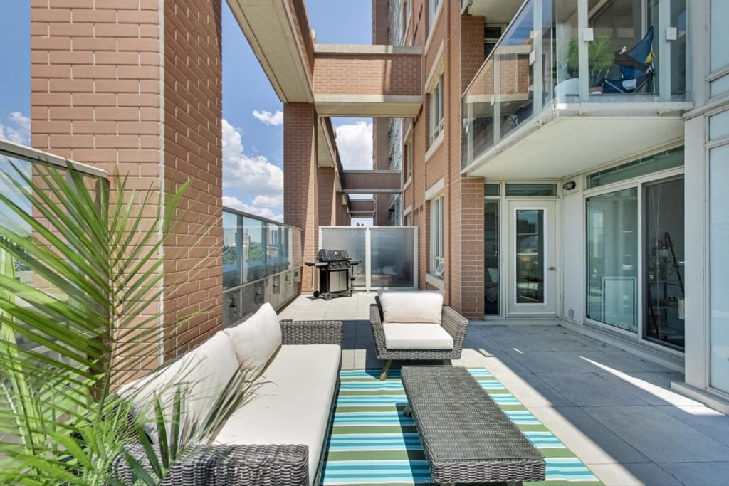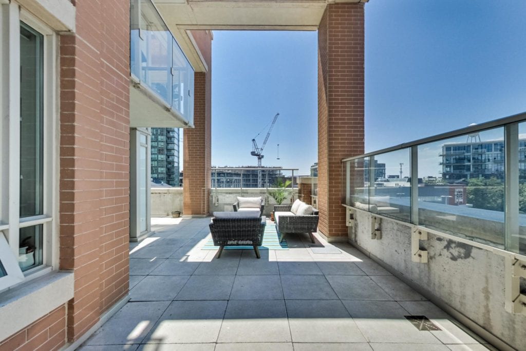 A bright two bedroom plus den with two full bathroom 894 sq.ft. corner suite and an incredible 748 sq.ft. outdoor paradise in prime Liberty Village! A thoughtful layout drawing light into all rooms, along with three access points onto the terrace (two sliding door access areas from the living room and a swing door from the principal bedroom). Create an outdoor oasis with maximum space for lounging, workouts, gardening, and al fresco BBBQ dining. Enjoy wonderful afternoon/evening sun from south western views across Liberty Village.