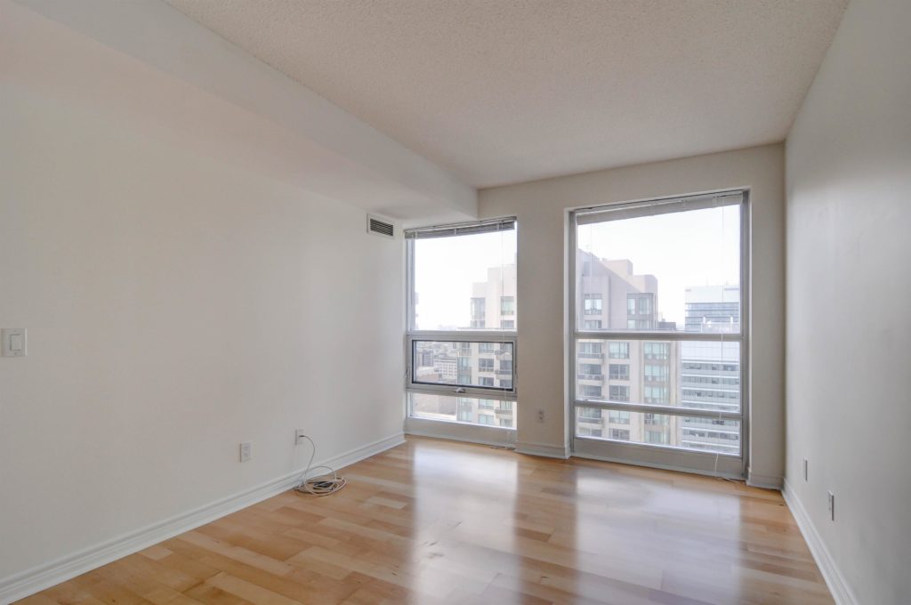 Gone in this suite are the tiny downtown Toronto condo bedrooms with just barely enough square feet to lay down a mattress: This corner suite with over-sized bedrooms at The Residences of College Park is a spacious dream! A generous corner suite split bedroom layout at Bay & College with south and west facing views is where it’s at. Plus, plenty of storage space in the U-shaped kitchen, in the entry hallway, and within both bedrooms with double closets. Includes a locker too, just in case you come really loaded with stuff. The rent includes hydro, heat, air conditioning and water. Set up your internet/cable and you’re set!
